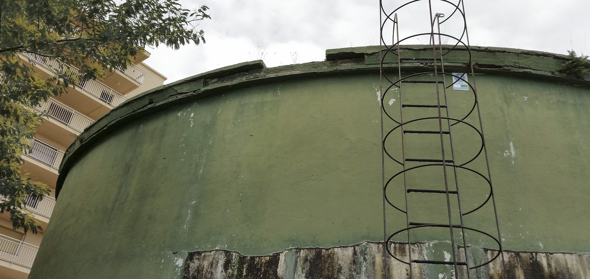 Rehabilitació i impermeabilització de dipòsit d’aigües previ repicat de l’adreçat interior a causa del seu mal estat. Neteja de la superfície amb màquina d’aigua a pressió. Retirada del morter en mal estat de dins del dipòsit. Reforç estructural de les fissures del dipòsit. Adreçat del dipòsit amb morter estructural sense retracció i remolinat d’aquest. Segellat d’elements punxants com, escales, tubs de ventilació i evacuació d’aigua, pilars, etc. Impermeabilització del parament amb morter elàstic impermeable.